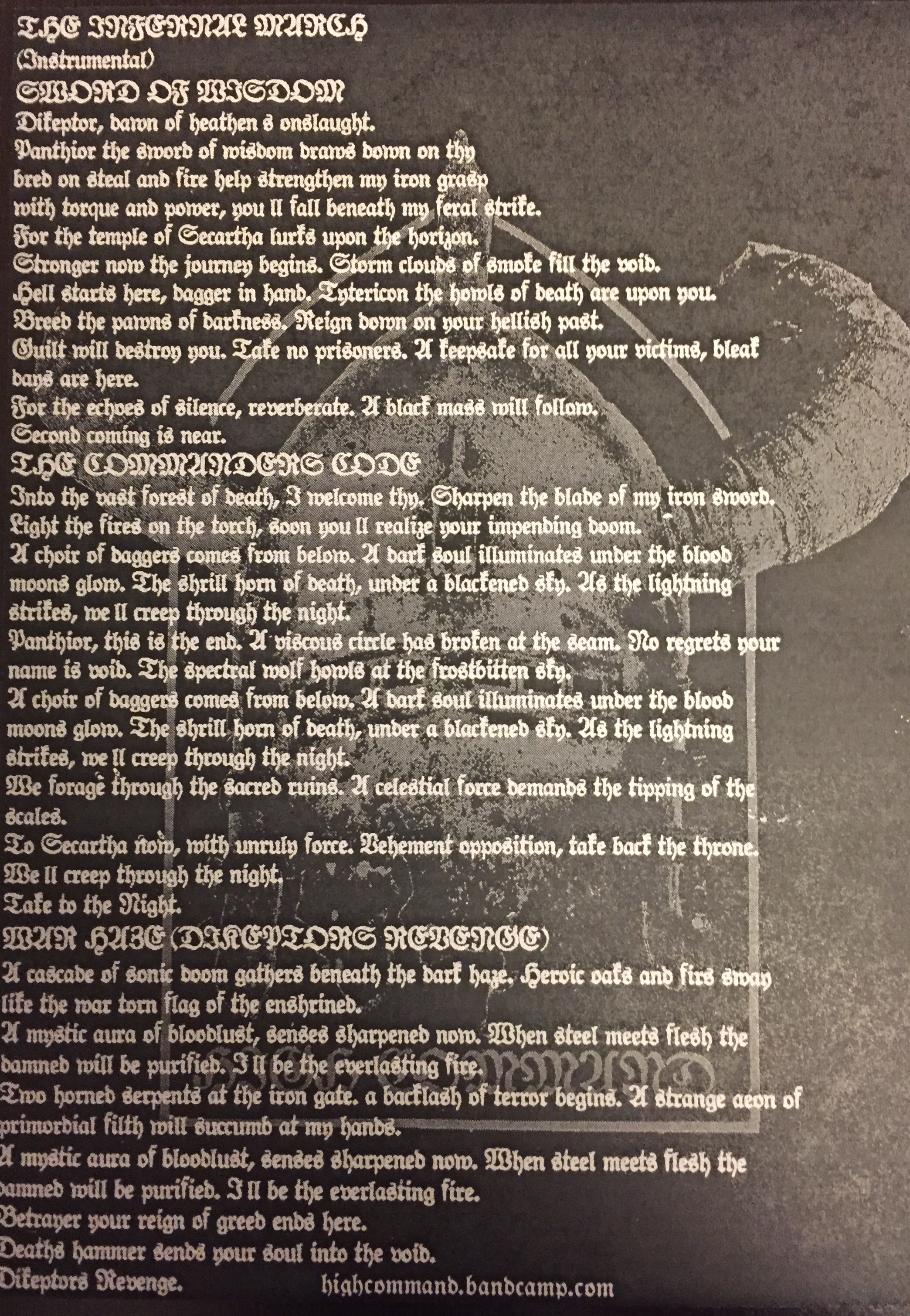 From the most barbaric wastelands comes “The Secartha Demos” from High Command. With razor-sharp metallic riffs, pure punk adrenaline, and an original Sword and Sorcery theme, High Command delivers a demo of skull crushing fantasy violence and aggressive atmosphere. If the brutal literary worlds of Robert E. Howard and Karl Edward Wagner manifested in the musical form of Sodom, Mercyful Fate, Integrity, and Cro-Mags, “The Secartha Demos” would likely be the result. For those who live for the lust of battle and music that bludgeons with the fury of a spiked-mace, the demo tape is now available via Haftvad Records.
